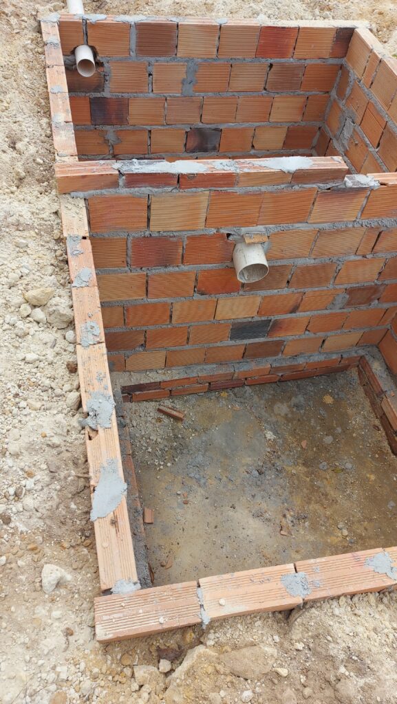 By the end of December, the remaining foundation holes had been dug at the back and reinforced with iron and concrete. Black bitumen had been painted on to protect against rising damp, the site had been levelled with sand, manually dug from the neighboring plot and moved by wheel-barrow; and the 2 sewers were complete.